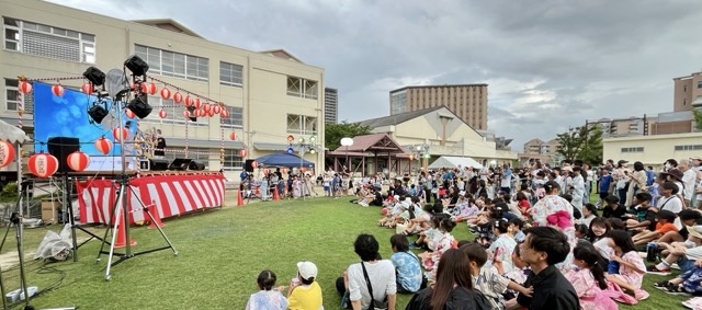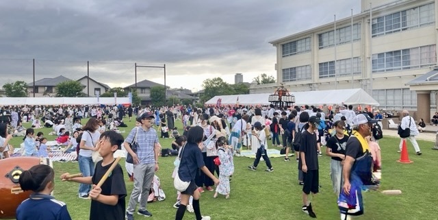 オープニング太鼓、子どもカラオケ、北崎太鼓、エンジョイフラ、先生方のステージ、ジョイフル&ロイヤルホストと、途中雨による中断があり、お楽しみラムネ早飲み大会中止となり、盆踊りも短縮されましたが、無事最後まで終えることができました。