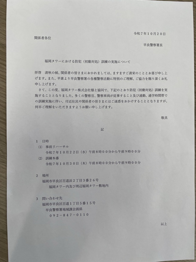 防犯訓練のため、多くの警察官や警察車両が福岡タワー周辺に集まりますので、皆様よろしくお願いします。