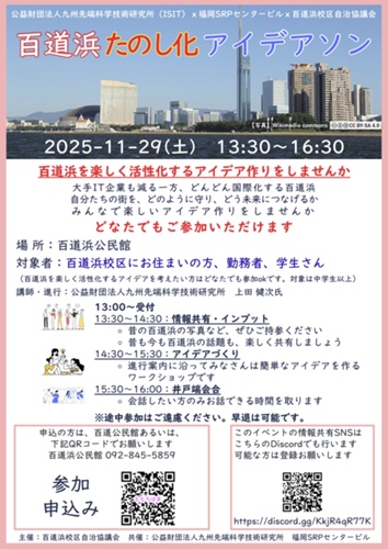 百道浜は街ができて30余年、海外からの旅行者が増加し、来年3月にはプリンスホテルがオープンします。今までの街も少しづつ変化していく中、これからの未来を見据え、将来の百道浜の姿を話し合いませんか?自治協議会の新しい取組として、「百道浜たのし化アイデアソン」を開催します。どうぞご参加ください。事前に申し込み制とな...