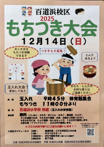 12月8日(日)に校区餅つき大会を開催します。ゴミ減量のため、できるだけ容器、お箸等をお持ちください。(詳しくは、ポスターをご覧ください)突き手募集しています。右申込下さい。→百道浜自治協議会momochihama_jk@outlook.jp同時に、玉入れ大会も開催します。よろしくお願いします。